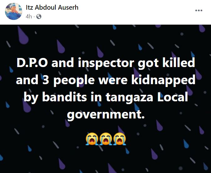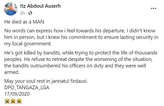“He’s got killed by bandits, while trying to protect the life of thousands peoples. He refuse to retreat despite the worsening of the situation, the bandits outnumbered his officers on duty and they were well armed. May your soul rest in jannatul firdausi. DPO_TANGAZA_LGA”